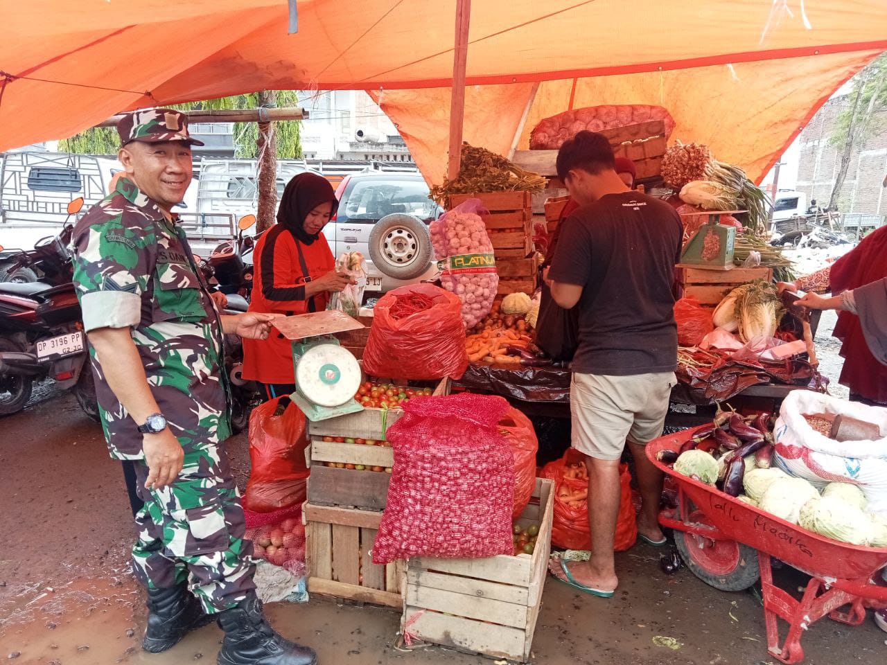 Babinsa Serma Syahniawan Dani memonitor langsung ke sejumlah pedagang untuk memastikan stok berbagai komoditas pangan utama, seperti beras, minyak goreng, gula, dan sayur-mayur, dalam kondisi aman dan mencukupi kebutuhan masyarakat.