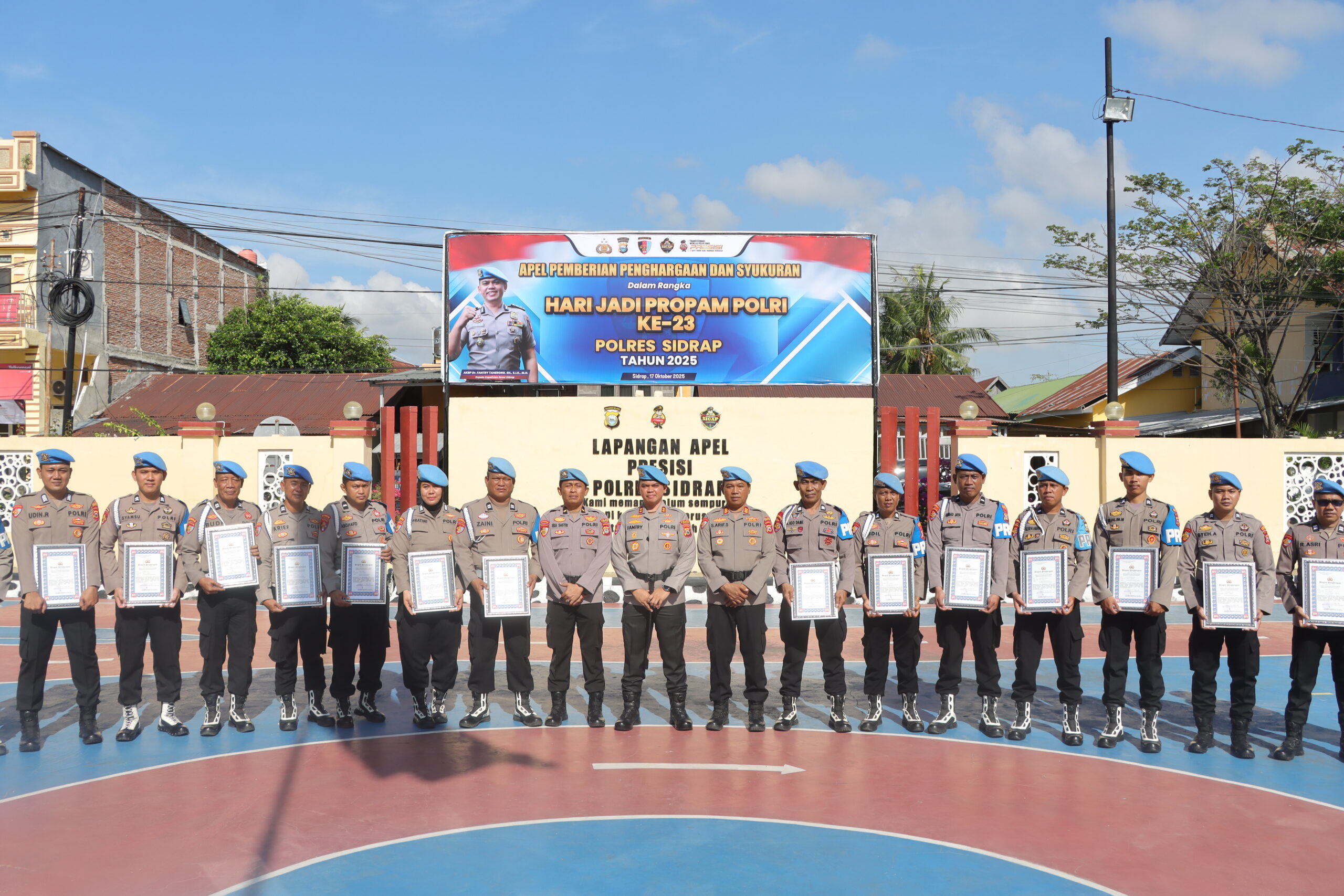 Kepala Kepolisian Resort Sidrap Akbp Fantry Taherong memimpin apel dalam rangka memperingati HUT Propam Polri ke 23 tahun 2025 di lapangan apel presisi Polres Sidrap, Jumat (17/10/25) pagi. Apel tersebut terasa istimewa dengan pemberian penghargaan dari Kapolres Sidrap kepada personel Propam yang dinilai berprestasi