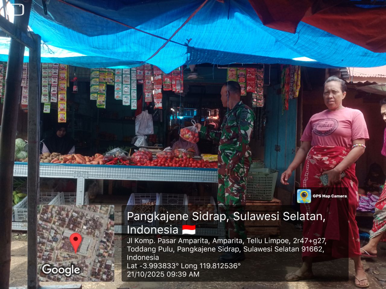 SIDRAP – Dalam upaya menjaga stabilitas harga dan ketersediaan kebutuhan pokok masyarakat, Serka Suardi, anggota Koramil 02/Tellu Limpoe, melaksanakan kegiatan pemantauan di Pasar Amparita, Kecamatan Tellu Limpoe, Kabupaten Sidrap, Selasa 21 Oktober 2025.