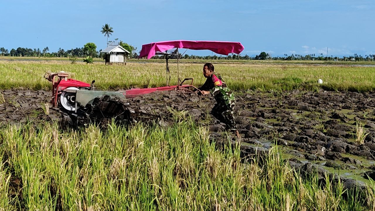 Babinsa Desa Sereang Koramil 1420-03/Maitengngae Serma Nursalam membantu petani diwilayah binaan membajak sawah menggunakan traktor di lahan seluas 30 Are milik H. Mustaking di Desa Sereang Kecamatan Maritengngae Kabupaten Sidrap, Senin (29/09/2025).