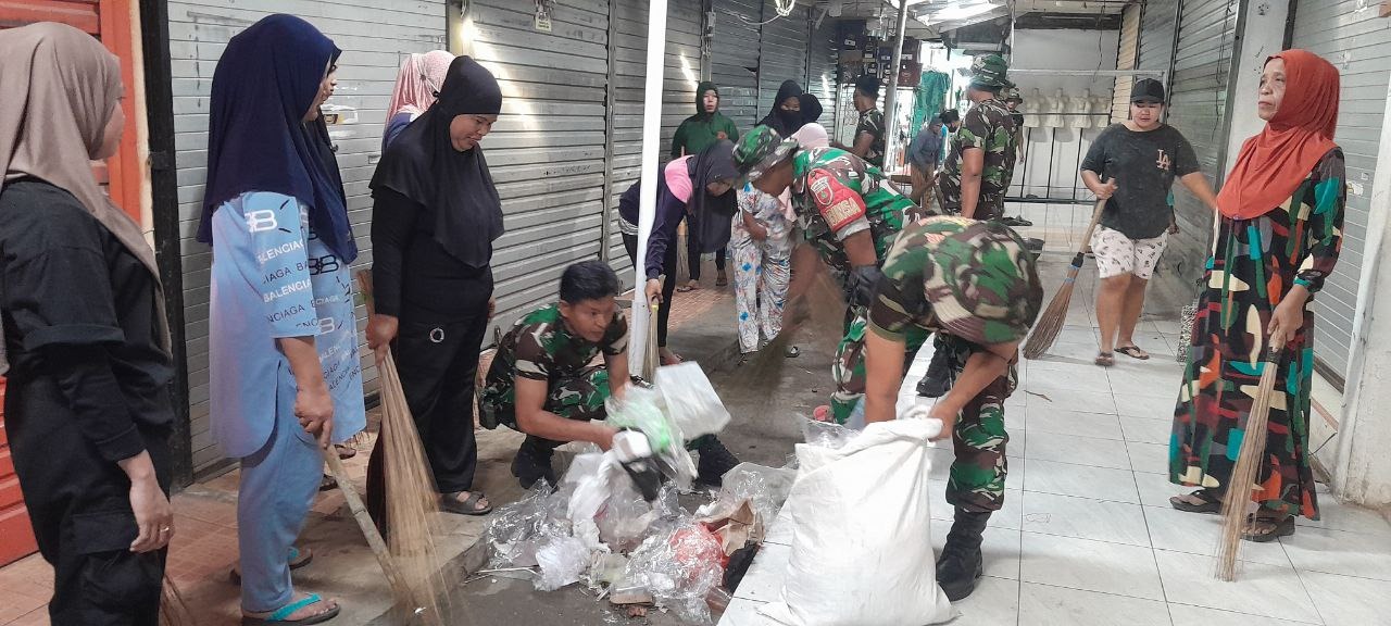 SIDRAP – Anggota Koramil 1420-03/Maritengngae Kodim 1420/Sidrap bersama warga setempat menunjukkan semangat gotong royong yang tinggi dengan melaksanakan kegiatan Karya Bakti pembersihan di Pasar Sentral Pangkajene, Kecamatan Maritengngae, Kabupaten Sidrap, pada hari Minggu, 19 Oktober 2025.